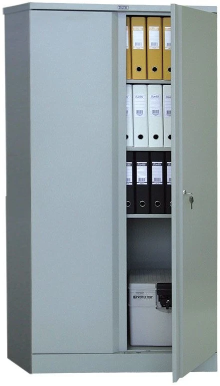 Двухстворчатый металлический шкаф с распашными дверьми, предназначенный для хранения крупных бумажных архивов, финансово-бухгалтерской отчётности и прочей документации в медицинских учреждениях любой направленности.