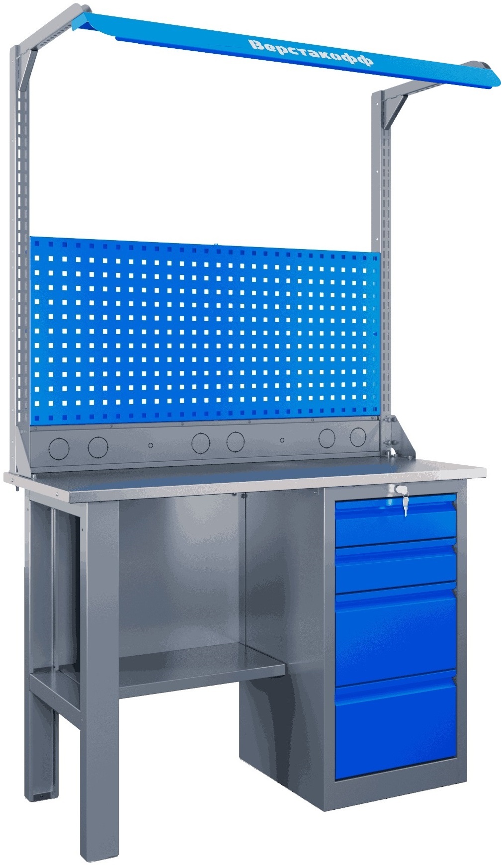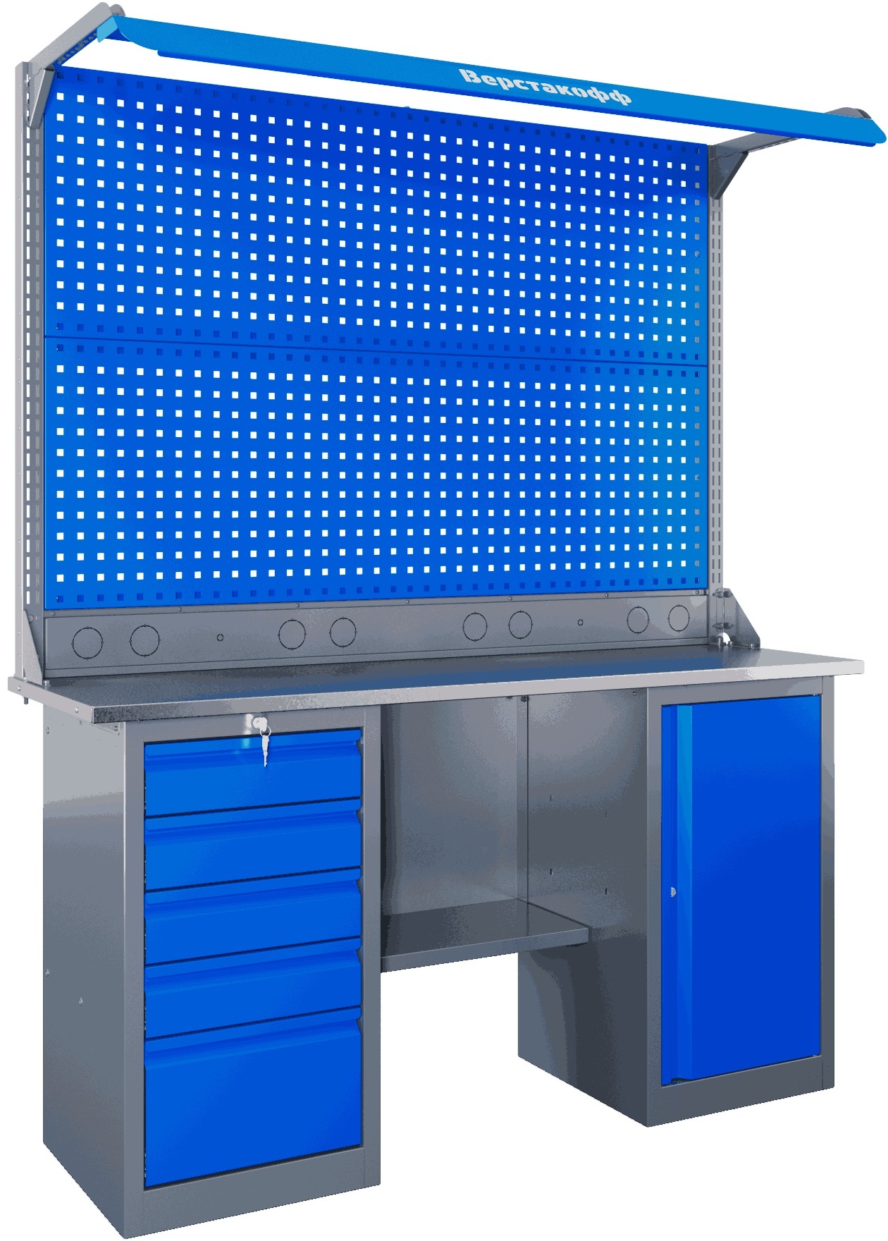 Компактный (всего 50 см в глубину), однако вместительный, с прочной столешницей, допускающей нагрузку до 200 кг, и продуманной системой хранения – Self подойдёт и для домашнего уголка мастера, и для школьного кабинета, и для гаража. А стильное сочетание пыльно-серого и небесно-синего цветов впишется даже в интерьер современной лофтовой мастерской.