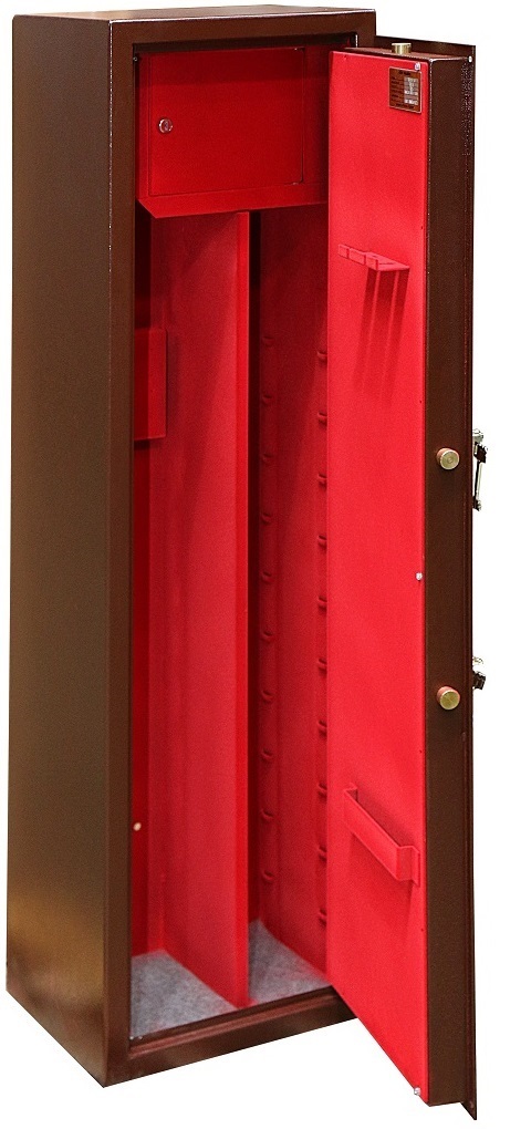 — Комплектация включает съёмные полочки с регулировкой по высоте, а также рамку для размещения ножей и гребёнку для шомполов и ключей, прикреплённые к двери изнутри.