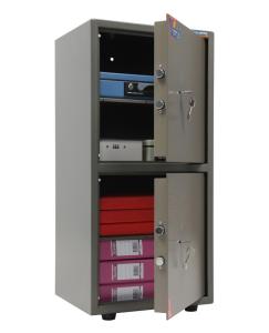 – Дверь каждой секции сейфа запирается ключевым замком производства KABA Mauer (Германия), а также двумя цилиндрическими горизонтальными ригелями.