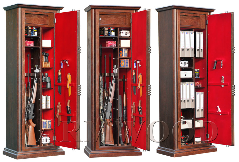 - Внутри сейфа есть запираемое (патронное) отделение и вертикальная перегородка, которая делит внутреннее пространство сейфа на две половины. Внутри одной половины есть пять съёмных полок и съёмные деревянные ложементы на четыре ствола. Также там имеется съёмный боковой роликовый ложемент-зажим (производства Германии) с регулируемой высотой установки (для хранения 5-го ствола, либо для дополнительной фиксации оружия с оптикой). Внутри второй половины есть пять коротких съёмных полок и съёмные деревянные ложементы на два ствола.